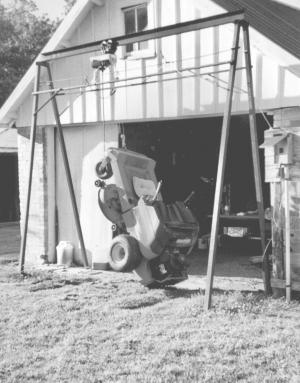 The hoist was built from 3-in. sq. tubing and measures 12 ft. high and wide, with the legs spread 4 ft. apart. A winch on top is powered by a 1/2 hp electric motor. Hussong attached a short length of chain to the front part of the mower, which he hooks up to the winch cable
