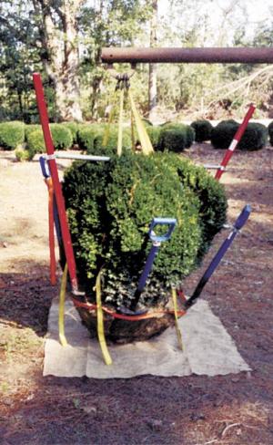 "It's simple, lightweight, and relatively inexpensive to build - the only cost is for shovels, clamps, straps, and pipe," says Reeson. "The plant is being lifted from the base of the shovels. You can use as many shovels as you want as long as it's an even number. I've used it on rootballs up to 4 ft. in diameter. I use two different lengths of shovels to keep the cross pipes from interfering with each other."