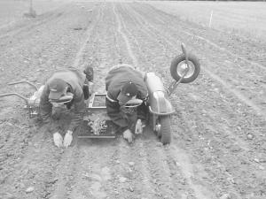 A 12-volt electric motor in each wheel propels the working bed through a field at up to 0.3 mph. A single battery charge powers the unit for 6 to 10 hours.