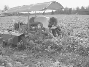 The Crawler is a battery-powered cart with foot-operated controls. A padded frame supports a reclining body and head, leaving hands free to do their work. At row ends, the cart can be moved to a new row or the body frame can be rotated 180? and slid sideways to return up the same row.
