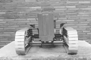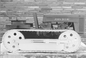 The tracked tractor is designed to look like a Deere 420 model, which was originally made in the 1950's. The driver turns the pedals to make the tractor go forward or backward. He pulls on a pair of levers to turn left or right.
