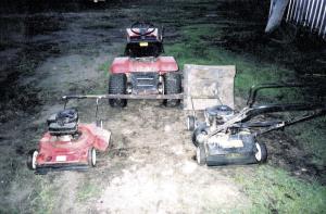 "The pull bar on the riding mower is about a foot above the ground in order to hold the push mowers off the ground. The threaded rod on each mower allows me to keep the mowers tracking correctly. I mounted a truck mudflap on the right side of the pull bar in order to keep the riding mower's cuttings away from the push mower on that side.