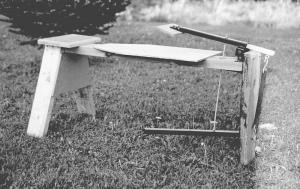 It's simply a 3-legged wooden bench with a piece of plywood for a work surface. An 18-in. length of 1 by 1 1/2-in. light metal tubing fastens to the end of the bench with a hinge, and a small plywood pad is bolted to one end of the tubing above the work surface. Two nails, spaced about 3/8 in. apart, protrude 1/4 in. through the plywood pad. A foot-operated lever, attached to the single leg directly below the hinge, is used to apply downward pressure on the pad to hold the fish in place. A piece of scrap wood at the other end of the tubing acts as a counterweight to hold the pad in the raised position.