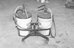 The 5-gal. pails are fitted with hand pumps and hoses on the lids so that no lifting is required at any time. The rig can be rolled around the shop or out onto the gravel outside, according to Stein. The castors are extremely stable, and the unit is well balanced. It doesn't even tip over when one pail is removed, so varying levels of lubricant in the pails have no effect.