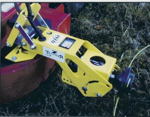 The Z-Trimmer is driven by a DC motor that operates off the mower's battery. It can reach out up to 20 in. from the edge of the mower deck, with the string cutting a path 14 in. in diameter. By loosening a wing nut, you can adjust the unit's lightweight aluminum head for both height and angle and move it in or out from the operator's seat via a lever. The unit has a 140-degree range of head movement for trimming or edging. A switch on top of the lever is used to turn the unit on or off. The switch also acts as a circuit breaker so if you accidentally run the trimmer against something and it stops, it'll trip the circuit breaker instead of blowing a fuse.
