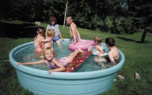 Our whole family has had a lot of free fun and cool relief splashing around in our "new" pool. Proof that it's a multi-purpose unit can be seen in the tooth marks around the edges left behind by calves suffering from boredom.