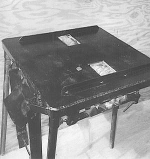 The 1/4-in. plate steel table has two rectangular cuts in it for the heads to come up through, and there is 1/8-in. angle iron bolted to the tabletop to serve as a cutting guide.