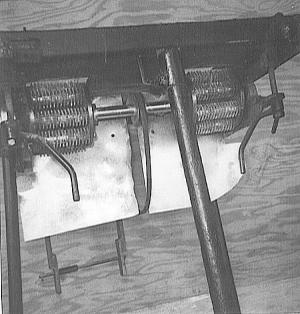 In the center of the shaft, between the two plates, there's a V-belt pulley. It drops down to the unit's 5-hp gas engine, which drives the whole thing. The arms that hold the bearings and the shaft, all swivel, according to Carlson. At the far end of these two steel arms, two little hand cranks with jam nuts allow you to raise or lower the cutting heads, and tighten them into position.