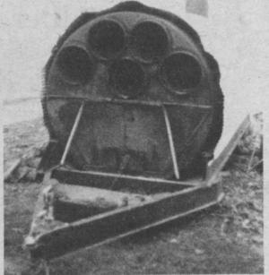 The unique furnace consists of a used 2,000 gal. fuel tank transversed end to end by 5 large pipes. Seeman made the pipes from old 100-lb. LP tanks welded together with the ends cut off. The tanks are made from heavy 10 ga. steel able to withstand high temperatures in the furnace. The pipes run through either end of the tank and are completely sealed from the fire chamber inside.