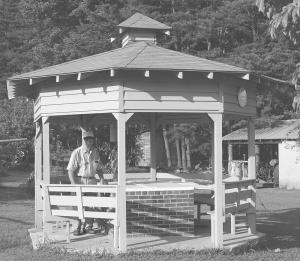The well is about 30 years old. It measures 30 in. in dia. and has a 57-ft. deep submersible pump and pressure tank. After building the gazebo, but before building the benches, Murray poured a concrete floor.