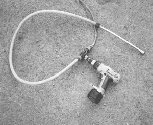 To speed up the process, he uses a cordless drill to shaft-drive a small pump. A 5-ft. long plastic hose with a metal tube at the end is attached to one side of the pump. A 1-ft. length of curved copper pipe hooks up to the other side of the pump and serves as a suction line. To feed a calf, he simply puts the suction line in the bucket and inserts the tube down the calf's throat, then starts the drill.
