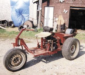 The "Little Red Horse," as he calls it, is powered by a 5-hp Briggs & Stratton engine and has the four-speed transmission off a Volkswagen Rabbit front wheel drive car. The engine belt drives a jackshaft that chain-drives the car's transaxle. A driveshaft extends from the transaxle to the pinion shaft on the rear end off a pickup, which was narrowed to about 4 ft.
