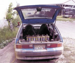 Working with an electric motor dealer in California, Herrington bought an electric traction motor made by Advanced DC Motors, East Syracuse, N.Y. (www.adcmotors.com; ph 315 434-9303). It cost about $1,500. and bolted right to the existing transmission. He outfitted the little Geo with nine 12-volt batteries carried in the back seat and trunk. With a full charge, Herrington can drive at up to 50 mph for 20 miles. A recharge takes him about three hours and costs about 25 cents.