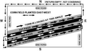 First make a pass around the end rows of the field. Then make your first pass in the direction the corn is laying down. At the end of the first pass, drive around the end rows without harvesting, and make another pass, leaving an unharvested strip that's narrower than the header. At the end of that pass, turn back to combine the narrow strip.