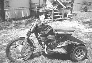 The frame, front forks with wheel and brake drum, and the gas tank were salvaged from an old 550 Honda motorcycle. A Murray garden tractor provided the rear end drive assembly axle and brakes. A 12 1/2 hp Briggs and Stratton provided the power, and a jackshaft and clutch assembly transfer the power from engine shaft to drive shaft.