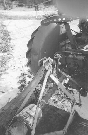 "I used scrap 3 by 3 by 3/8-in. angle iron under the tractor for reinforcement, and for the rods that go to the sides of the mower, I used 18-in. long pieces of 3/16 by 2-in. flatbar," Masyk says. "The top arm consists of two pieces of 1/4 by 2-in. flat iron, that come to a V at the tractor. I welded them to the angle iron base. There's a small 2 1/2-in. Chev. pulley bolted onto the point of the V. I bolted the winch to a piece of 1/4-in. plate, and then bolted the plate to the available holes on the top of the transmission. From there, the cable runs over the top of the pulley, and it goes down to two 1/4-in. chains (straddling the pto shaft) that are bolted to the base of the mower."