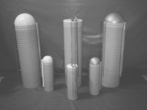 Klettke makes two types of mini silos - A.O. Smith Harvestore, and stave (concrete) silos. He uses sections of pvc pipe and sands them to roughen the surface before painting. To make the silo's horizontal reinforcement rings and vertical reinforcement bars at the base, he uses pin striping (from an auto supply store), or sometimes just paints them on.