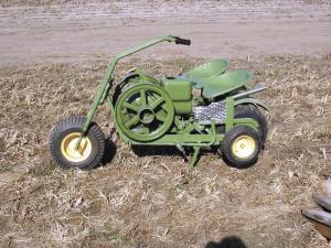 He built another unique vehicle, combining a Heald minibike frame with an antique "hit & miss" Deere 1.5-hp model E. The little motorcycle tops out at 6 mph and even has a sidecar.