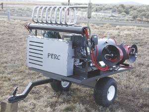 The PERC 412 model is a 4-hose, trailer-mounted unit with ATV tires and a 13 hp gas engine, while the "PERC 206," is a 2-hose, skid-mounted unit with a 6.5 hp gas engine. Both are made to pull behind an ATV, and leave no tracks in growing crops or on golf courses or parks.