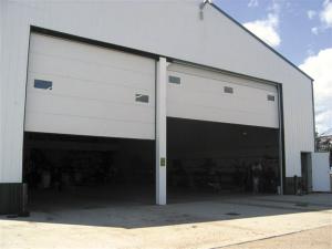 The post slides to the side on a 16-ft. length of track over the smaller door.