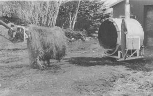 The furnace has a 5 by 5-ft. 4-in. fire chamber and 5 by 6-ft. water jacket and weighs more than 4,000 lbs. It has a full-size door 15 in. off the ground that opens up for easy loading of the bale and for ash removal. Big bales are loaded into it with a tractor or skid loader.