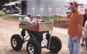 The wagon has a 4-ft. long by 2-ft. wide box that sets about 4 ft. off the ground and rides on 12-in. high golf car wheels. It's fitted with air bags off a semi tractor, and a homemade, 4-link suspension system. An air tank off a semi tractor mounts under the wagon. Cates can adjust the pressure in the air bags by flipping an air-operated switch.
