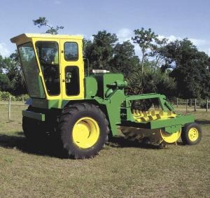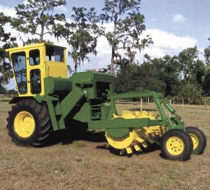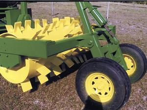 He mounted the combine's drive axle and cab on the front section. A swivel system at the articulation point allowed the aerator on the rear section to oscillate. The aerator drum is 30 in. in diameter with 6 by 6-in. hard alloy steel plates with gussets. They are welded every 6 in. in the shape of tire treads and staggered front to back. Filled with water, the drum provides more than enough weight to penetrate and open even the most heavily compacted ground.