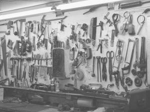 Sherrard has a system to make shop work easier. When he sets a tool or part aside for a moment, he must remember its location, so as not to trip over it later. He puts nuts, bolts, and small parts into cans, shallow cardboard boxes or his pockets as he removes them from a machine. His grandsons assist him by replacing his tools on the wall when he's finished using them, and thanks to white lines painted around each one above his work bench, they always go back to exactly the same spot.