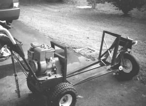 He unbolted the impeller and housing from the snowblower, keeping the handlebars, frame, and transmission. He replaced the snowblower's original 6 hp electric start engine with a 5 hp, rope start Briggs & Stratton. The snowblower's wheels were replaced with bigger, 12-in. high wheels off a Bolens riding mower, and the straight drive axle was replaced with the mower's chain-drive differential in order to make it easier to steer with the caster wheel on front.