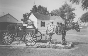 To get started with his full-size version, he drew the horse on plywood. He cleaned the horseshoes well, washing them in acid, then wire brushed them so the welds will be strong. Racehorse shoes are the easiest to work with, he says, because they're all similar in size. He estimates there are about 450 horseshoes in the sculpture. He painted the horse with black and white spray paint and welded it to two iron posts in his front yard and built a wooden cart behind it with an aluminum bottom for his wife, Hazel, to plant flowers.