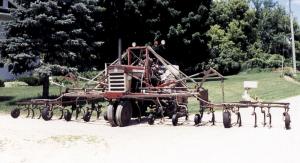 Tired of hiring out the sidedressing liquid nitrogen, Nolan Knight decided to do it himself. While a rear-mounted toolbar would have been easier to adapt, he figured a front-mounted applicator would work better on his northeastern Iowa hillsides. Knight created a 12-row cultivator/applicator from parts of these older cultivators. Liquid N is pumped from a rear-mounted 125-gal. tank and dribbled behind a single shovel to one side of each row.