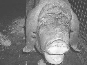 "The meat is well marbled with ribbons of fat throughout. It is really tasty, very flavorful," says John Newton, ISU research station superintendent. "The trouble is there isn't much of it. If you butcher them at 200 lbs., you'll get less than 30 percent edible meat by the time you remove the excess fat, skin and bones."
