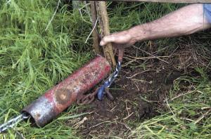 The "brush strangler" consists of a piece of thick-walled pipe with a short length of chain welded to the side. It's used to yank out brush and small saplings.