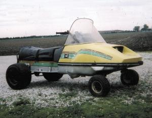 Snowmobile On Wheels ATV S ATV S It s fun to drive and gets a lot of looks wherever I go says Dean Wirick West Liberty Ohio about the 4-wheeled ATV he made from an old John Deere snowmobile The converted 1979 John Deere Trailfire snowmobile still has the original 340 cc engine and variable speed snowmobile transmission Wirick equipped the rig with 8-in tires from a riding mower on front and 12-in tires on back I built it because I already had three snowmobiles but no 4-wheelers says Wirick I call it the Wild Thing because riding it is such a wild experience It ll go up to 50 mph yet the engine is geared down so it ll also creep in low gear Sometimes I take it to antique tractor shows where I put out a sign that says æNo snow needed Wirick cut off the snowmobile tracks and skis and bolted a homemade axle on back He fastened a bracket where the skis used to be and welded spindles off a riding mower to them The next step was to weld a sprocket on the snowmobile s jackshaft on front and another sprocket on the rear axle A heavy-duty chain off a manure spreader runs down the middle of machine and around the sprockets I already had the snowmobile and paid $100 for the axle sprockets and chain The hardest part of the job was lining the chain up and making sure everything was straight I wouldn t try this idea on a bigger more powerful snowmobile because you d go too fast to be safe I don t drive it on rough ground because the snowmobile doesn t have any suspension and will bounce around a lot Also it s probably not a good idea for kids to ride it because it s a bit tricky to control notes Wirick Contact: FARM SHOW Followup Dean Wirick 7005 St Rt 68 N West Liberty Ohio 43357 ph 937 699-0399