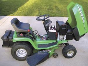 Installation of the new components was relatively easy. After removing the engine and gas tank, he mounted two batteries in the front and two in the rear. He had to make an adapter plate to match the existing drive pulley to the shaft of the electric motor. The Sabre is a unibody structural design with channels on each side of the mower.