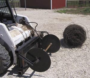 He made the roller out of 3-in. square tubing, a skidsteer bracket and 1/4-in. thick steel discs. A hydraulic motor spins the roller at the same speed as the skidsteer and also has reverse. When the winder is full, Gorrell loosens a nut and pulls off one of the ends and moves the skidsteer to dump the roll of wire. It's tightly wound and ready to sell for scrap. To save good barbed wire, Gorrell uses a different spool to wind one strand of wire at a time.