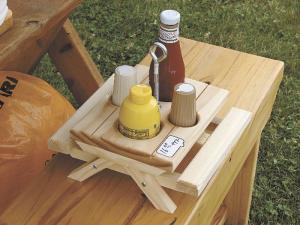 Woodworkers hate to see anything go to waste, and Glenn Young is no exception. He builds lawn furniture for sale at craft shows and always has a pile of scraps in his shop. One winter he and his wife were on a trip in Texas and he saw a clever condiment holder made of wood. "It looked just like a picnic table, " said Young, "and since I had plenty of scraps, I decided to make one myself."