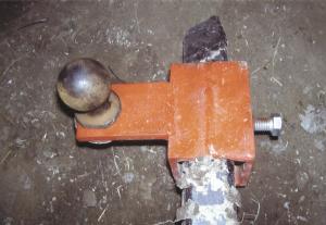 Ball Mount Fits On 3-Pt. Mounted Bale Forks HITCHES Hitches 33-5-41 A friend of mine has a portable sawmill and had been using his pickup to move it. He also has an Allis Chalmers tractor with which he sets logs on the sawmill. He wanted an easier way to move the sawmill, so I came up with a ball mount that lets him use the 3-pt. mounted bale forks on his tractor to do the job.