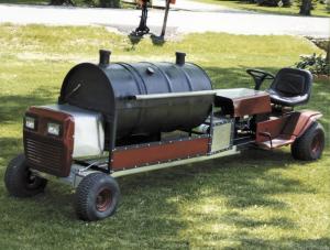 He started with a 1989 Montgomery Ward riding mower. He cut off the front axle and extended the tractor frame to 11 ft. He made the extra-large grill itself by welding one-third of a barrel to the end of another one. A pair of exhaust ports on top of the grill allow smoke to exit.