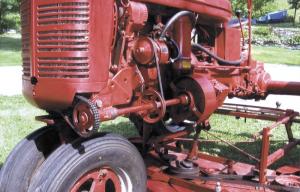He welded a sprocket on the engine's crankshaft, which chain-drives a shaft that runs alongside the tractor. The shaft belt-drives a power steering pump that raises or lowers the mower. It also runs through the clutch off a Mazda car and then connects to a right angle gearbox. A vertical shaft off the gearbox drives the mower blades and runs through a constant velocity joint mounted on the deck. "The vertical shaft's angle changes whenever the mower is raised or lowered, which is why the universal joint is needed," says Alstad.