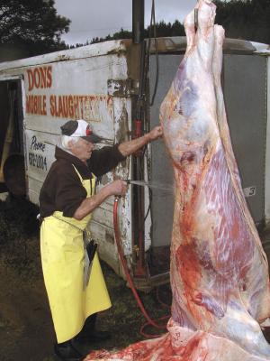 Don Livermore doesn't sit in town waiting for someone to bring in an animal for butchering. He takes his rig to the farm and butchers right in the backyard. In 90 min. he can kill, clean, quarter and load a full size head of beef. Within 2 to 3 hrs. of the animal going down, it's being cut up at a local meat cutting shop.