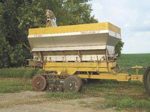When the tanks are empty, filling them takes less than 10 min. with a 24-in. apron elevator that slides right under the hoppers of their semi-trailer. The Mulvihills found the rig on an internet auction and knew it was just the ticket for loading fertilizer. After towing it home 400 miles, they renovated the frame, tuned up the motor and the hydraulics and it runs like a new one at 1/4 the cost. Their final touch of hands-free operation is a simple electric motor with a hand-held remote to open and close the hopper gate on the semi. In this age of speed, economy and precision, the Mulvihills have dry fertilizer application down to an exact science.