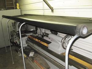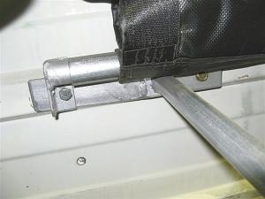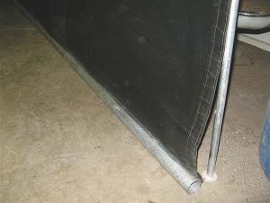 "The tarp has a long pocket at the top end with a 1-in. dia. pipe through it. That pipe is screwed to the wall," he explains. "In a pocket at the bottom of the tarp, there's a bigger 2-in. dia. pipe, which allows me to manually roll it up faster. The size and weight also makes it unroll quickly."