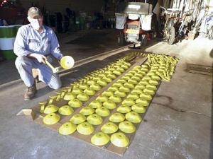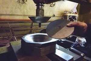 Devloo pressed the scrapers out of flat 8-in. dia. metal discs in his shop. He presses the discs down into a metal bowl. "When the 8-in. dia. metal disc is pressed down into the bowl, it becomes a cup-shaped, 7-in. dia. disc," notes Devloo.