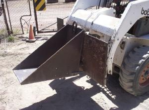 The base of the bucket is tipped away from the faceplate by two adjustable 5/8-in. bolts. Kennedy used the bolts so he could get the correct spacing to compensate for the less than 90-degree angle inherent in Bobcat arms. He notes that some skid steer buckets tip way back on the ground, but Bobcat buckets don't.