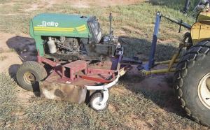 He pulls his 4-wheeled "trail-a-mower", as he calls it, behind his IH Cub 70 15 hp tractor but says it could be pulled behind any garden tractor or ATV.