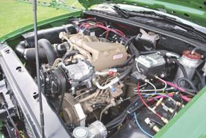 The vehicle's cab, hood and front fender wells came off a 1995 Chevy Silverado S-10 SS pickup and mount on a home-built frame and air-ride suspension system. The front axle is a Dana 60; the rear axle is a Chevy 14-bolt with Dana 60 knuckles. The rear axle can be independently steered using separate controls inside the cab.