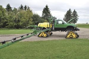 The pickup sprayer mounts on 40-in. tall tires, or 16-in. wide tracks. "The tall tires or tracks provide the pickup with about 16 in. of clearance, compared to 6 to 8 in. of clearance on conventional pickup sprayers," says Hanson. "Putting tracks on a standard pickup can tear up the front end of the truck in no time. However, my pickup was beefed up to handle them. And the on-board air system lets me keep all 4 wheels spinning at the same time in muddy ground."