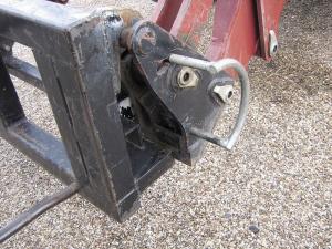 "You're supposed to be able to pull a æC' ring to disengage the bottom latch, then drop one implement, hook on to another and engage the bottom latch to it by tilting the loader. When it works, you only have to get out of the tractor cab once to change implements. But it never works because the pins in the latch get bent and then it won't trip to engage. And when the pins are straight, it trips before you can hook onto another implement. Either way, you have to get out of the cab twice."