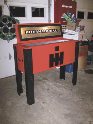 The wood cooler stands about 3 1/2 ft. off the floor and is painted red with black legs and a black IH logo on front. It measures 4 ft. long by 20 in. wide and 16 in. deep and is built from 1 by 4-in. pine. The interior is lined with 2-in. thick Styrofoam and furnace tin with a drain at the bottom. When opened up, the hinged lid displays a black and white IH decal taken off a tractor hood.